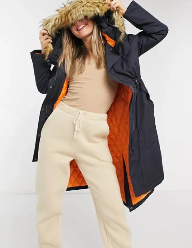 Еще одна классическая модель – женская парка с мехом на капюшоне в темно-синем цвете. Ярко-оранжевая стеганая подкладка будет не только хорошо согревать и удерживать тепло, но и станет акцентом в любом образе, если ты решишь носить парку в расстегнутом виде. Благодаря лаконичному дизайну и минимуму деталей парка отлично смотрится как с расслабленными трикотажными костюмами, так и с более элегантными и строгими вещами (например, с классическими брюками). Кроме того, модель понравится тем, кто придерживается концепции экологичной моды: парка выполнена из переработанного полиэстера, который в свою очередь был создан из переработанных пластиковых бутылок и текстильных отходов.