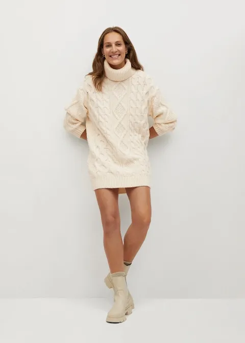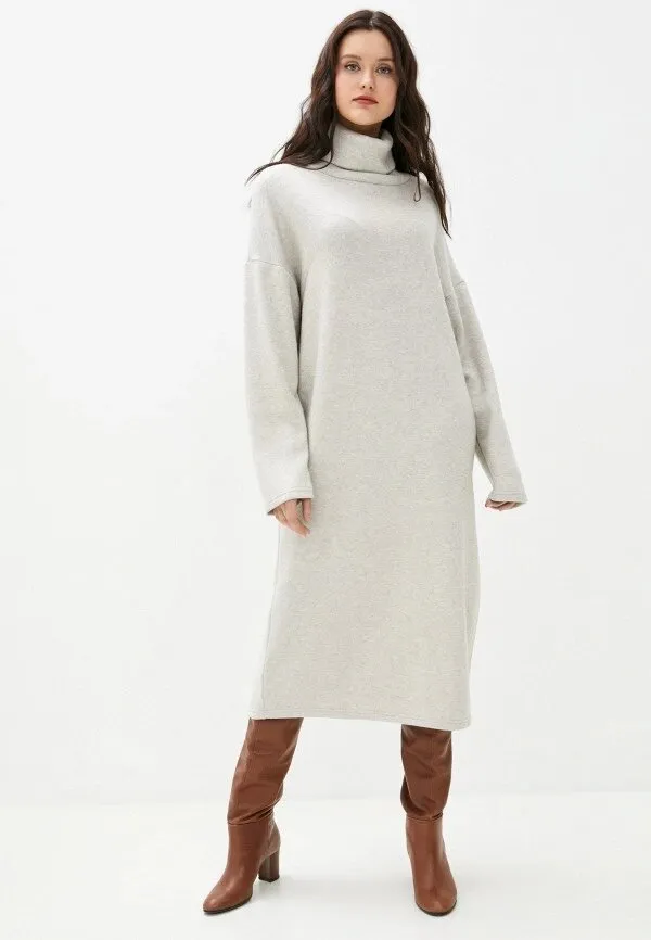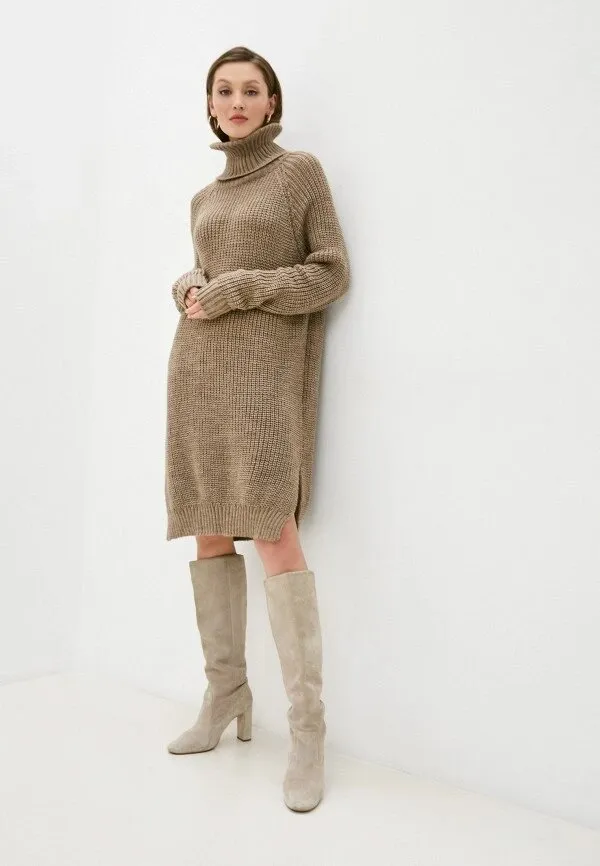 Классическое платье-свитер с высоким горлом и небольшими разрезами по бокам. Элегантная модель крупной вязки сочетается и с грубыми ботинками, и с мягкими высокими сапогами.