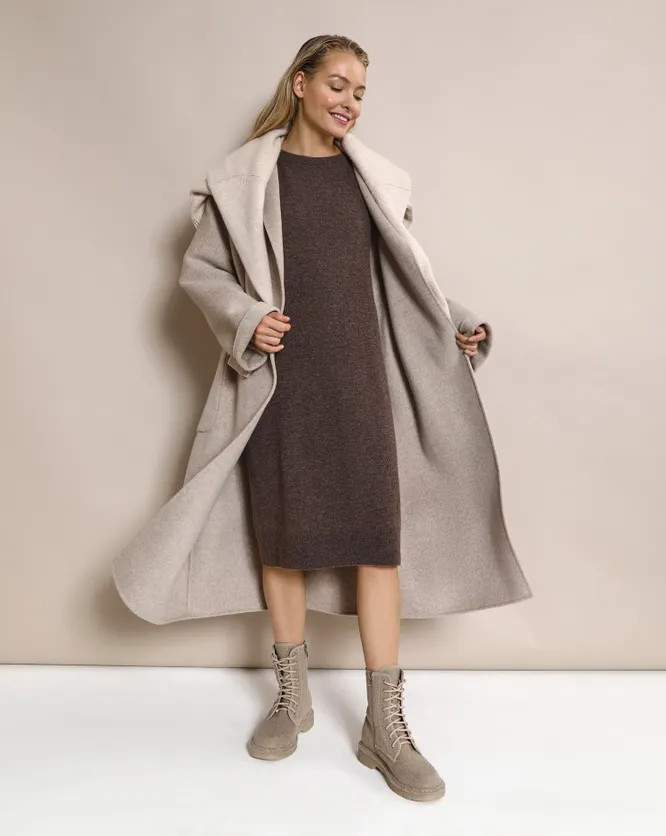Самый простой способ носить шерстяное платье в новом сезоне — добавлять его в монохромные фэшен-луки. Надень коричневое платье свободного кроя и поддержи его ботфортами с напуском, коричневым ремнем и длинным пальто в тон общей палитры. Получится понятный и красивый комплект на каждый день.