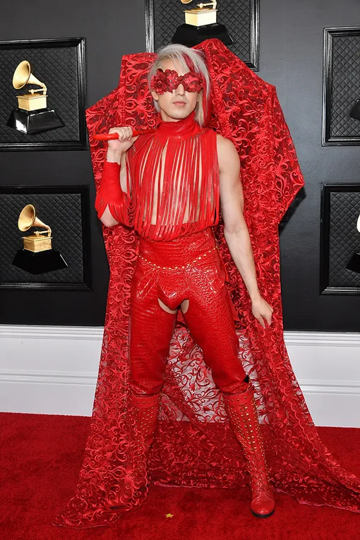Мы за агендерную моду и право мужчин носить юбки, но есть одно но: это может и должно выглядеть стильно. В этом случае школьная форма никак не сочетается с фраком, фасон которого усложнен необычными полами. Финальным аккордом образа становятся ботинки, над которыми явно постарался Человек-паук в соавторстве с черепашками-ниндзя. Попытка засчитана, но вряд ли ее можно считать удачной.