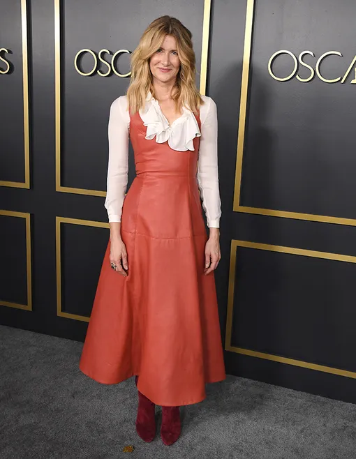 Очередной пример, когда длина портит всё. Юбка, застрявшая между миди и макси, творит волшебство с ростом Лоры, которое вряд ли ее порадует. Шифоновая блузка под кожаное платье, конечно, тоже вызывает вопросы, но фасон платья — проблема куда значительнее.