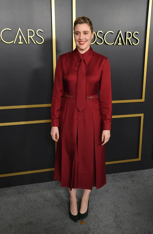Галстук — интересная деталь фасона, которая может сделать интересным как мужской, так и женский наряд. Но не в этом случае. Закрытое платье с акцентом в виде вышивки на талии с плиссированной юбкой и галстуком напоминает строгую школьную форму, а никак не стильный наряд для красной дорожки.