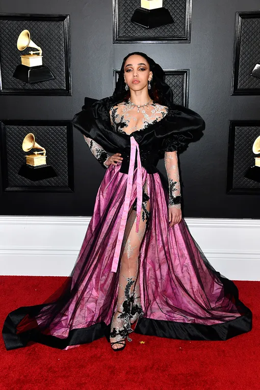 У платья FKA Twigs слишком много деталей, которые вместе не создают органичной картины. Непонятно, на чем сосредоточиться: то ли на объемном верхе, то ли на кружевной вуали с вышивкой, то ли на пышной юбке с глубоким вырезом. В этом случае стоило выбрать один акцент, а остальное отложить до следующих светских мероприятий.