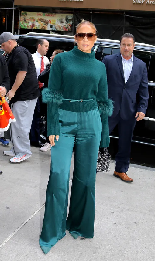Джей Ло выбрала прекрасный оттенок - сейчас как раз такой в моде. Но что за перья на рукавах, тонкий ремень на талии и атласные брюки, которые забыли подшить? Очень неочевидный выбор фасонов.
