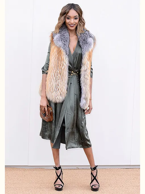 Джордан, безусловно, одна из самых ярких и красивых моделей современности, но, к сожалению, при выборе нарядов девушка даже не пытается учитывать особенности своей фигуры. Результатом становятся такие вот образы а-ля «чупа-чупс» — с до безумия объемным верхом и ножками-зубочистками. Вдвойне обидно, что ситуацию можно было исправить очень и очень легко: либо снять меховой жилет, либо заменить босоножки на высокие замшевые сапоги.