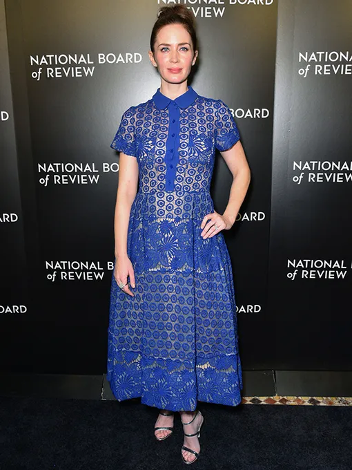Платье Эмили стилизовано под «голые» платья, но таковым не является, от чего, собственно, и выглядит крайне странно. Вдобавок такой оттенок синего сделал синей и кожу самой актрисы.
