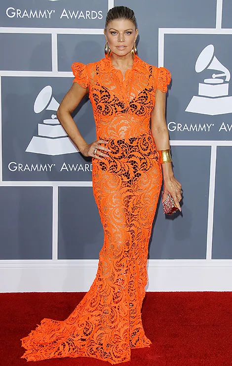 Ферджи хотела поразить всех сексуальным нарядом, но кислотное оранжевое платье слилось с кожей и получился один кружевной фонарик.