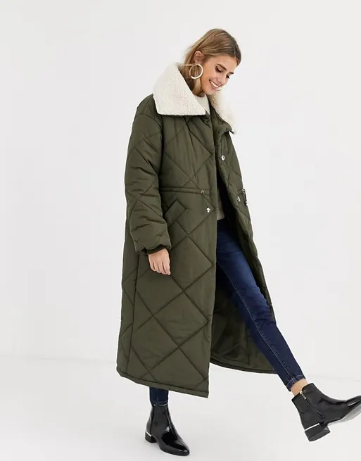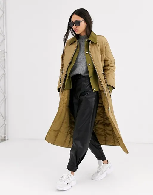 На помощь черному в этом сезоне приходит хаки — отличный способ слегка разнообразить свой базовый гардероб. Оттенок не уступает в универсальности, при этом не так широко используется, а значит, в нем ты будешь отличаться от окружающих. Обрати внимание на стеганое пальто такой расцветки, декорированное воротником из овчины, — очень интересный вариант на зиму.