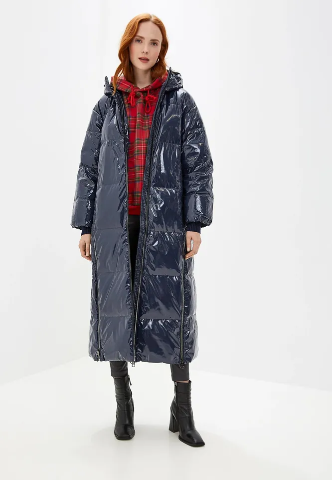 Для тех, кто предпочитает одеваться посмелее, мы нашли темно-синий пуховик из глянцевого материала. Его плюсы дизайном не ограничиваются: в качестве утеплителя — натуральный пух и перо, благодаря чему будет тепло даже в самые холодные дни.