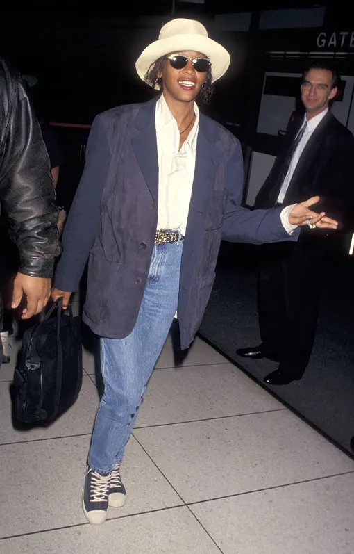 Уитни оставила свой след не только в музыке, но и в моде. Ее образы из стритстайла с неожиданными сочетаниями аксессуаров и сегодня приятно удивляют. Добавив белую летнюю шляпу, Хьюстон сразу перевернула свой лук от формального наряда без ярких деталей к образу с модной индивидуальностью.