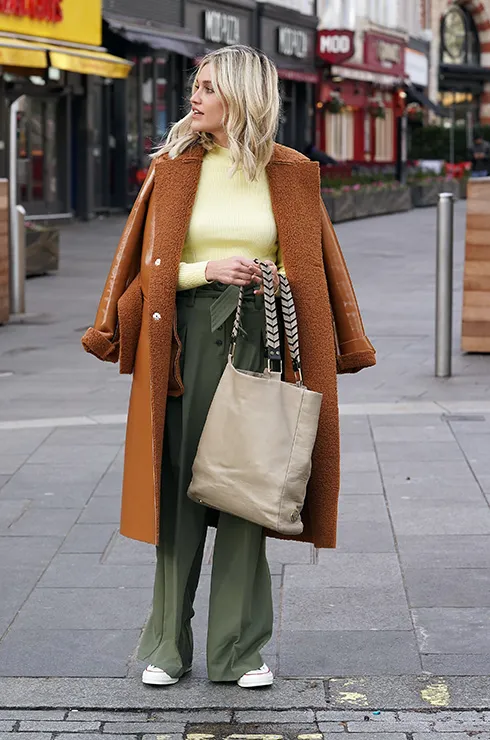 Очень хорошо пальто в клетку смотрятся с платьями и комбинезонами, который по цвету сочетаются с одним из оттенков клетки. Особенно, если это самый яркий цвет, используемый в принте. Добавляем большую сумку-шопер и обувь в спортивном стиле.