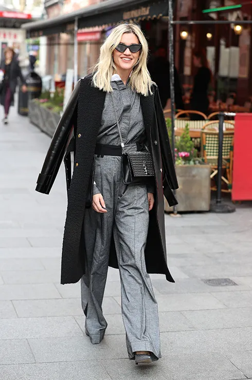 Если в вашем гардеробе есть черное пальто с рукавами из кожи, добавьте к нему серый комбинезон из костюмной шерсти – однотонной или в неяркую клетку. Подчеркните талию широким ремнем и сделайте акцент на аксессуары: эффектную сумку и солнцезащитные очки.
