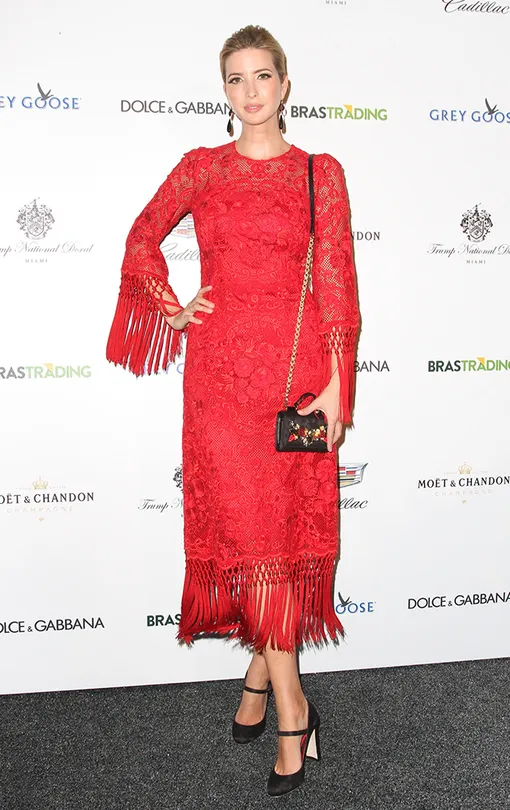 Блондинка в красном — модная классика, и Иванка в ней поистине безупречна. Обрати внимание на отлично подобранные золотые аксессуары.
