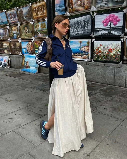 Повседневный, но в то же время элегантный образ легко создать за счет правильных стилистических решений. Жемчужное ожерелье в сочетании с кожаной сумочкой и длинной юбкой может выглядеть скучно и довольно предсказуемо, но кроссовки и подходящая спортивная куртка превращают комплект в непринужденный и задорный образ на пике трендов.