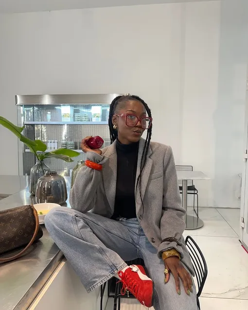 Элегантный блейзер, большие очки и подходящие кроссовки — и у тебя готов спортивный офисный образ. Если подберешь тот же тон в украшениях, то это только подчеркнет твое чувство стиля. Посмотри как классно работает в образе сочетание кроссовок и массивного браслета.