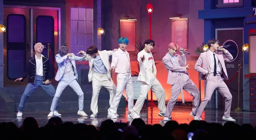Модный трибьют битлов на заре их успеха созвучен с нынешним сценическим стилем корейских артистов. Стилисты BTS в данный момент сфокусировались на проверенной классике с яркими акцентами и нотками расслабленности. В самом клипе на песню Boy With Luv много костюмов – от белых с перьями до фиолетовых с глиттером (подробный разбор вы найдете в отдельной статье). В корейских выступлениях царила нежная пастель с мешковатым кроем и двубортными пиджаками.