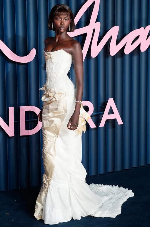 За заслуженной наградой на церемонию Fashion Awards в Лондоне Анок пришла в эффектном платье Dilara Findikoglu, которое никого не оставило равнодушным. Мерцающий оттенок слоновой кости, «русалочий» подол и шлейф, окрытая линия плеч и драпировки — наряд для настоящей звезды фэшн-индустрии.