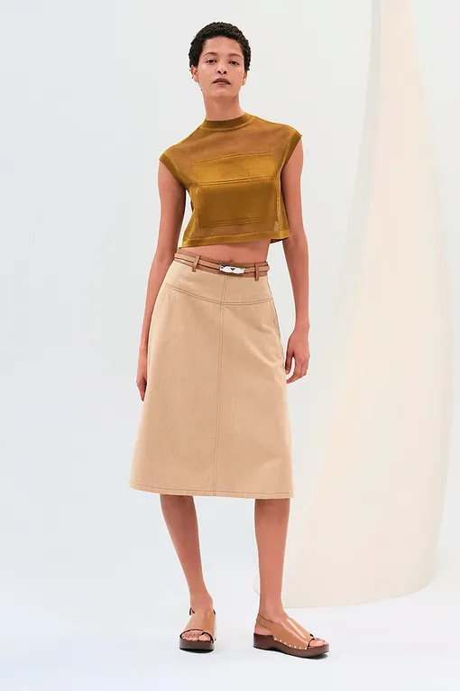 Джессика выбрала юбку Hermès с контастными поясом, но ты спокойно найдешь аналог и в масс-маркете. Отдавай предпочтение миди-моделям из натуральных тканей — так твой лук будет смотреться «дороже».