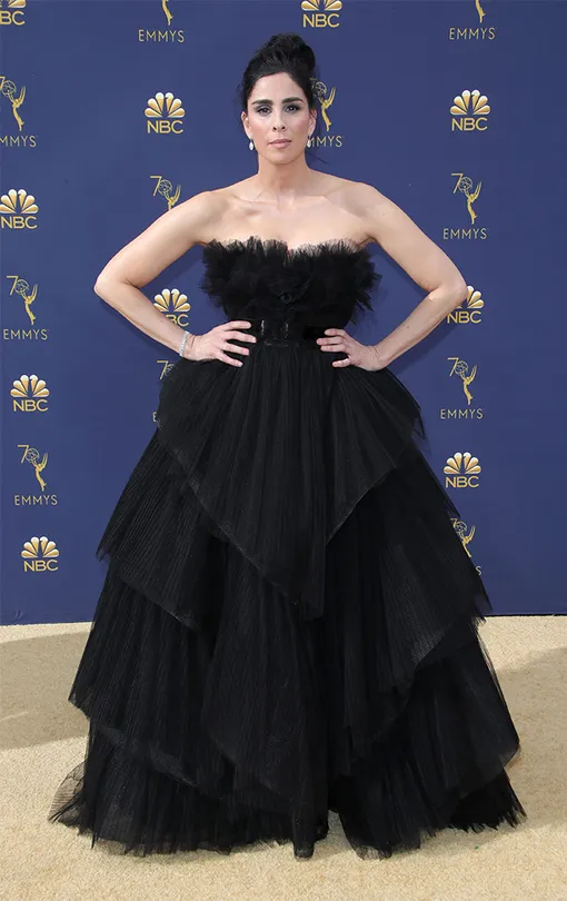 Total black — не всегда удачная идея, что подтверждает образ Сары Сильверман: черное платье в сочетании с темными волосами и макияжем с акцентом на глаза и брови смотрится слишком «тяжело» и мрачно.
