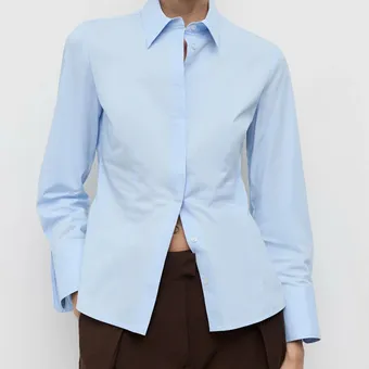 Завершающим же штрихом, который и сделал базовый лук таким классным, стала светло-голубая рубашка от бренда With Nothing Underneath (кстати, стоимостью всего 95 фунтов стерлингов). Голубой вполне соответствует классическому дресс-коду и отвечает утонченному стилю, которому следует Кейт, но свежий, ледяной оттенок цвета поднимает лук на новый уровень и придает ему живость. Теперь даже формальный образ выглядит вовсе нескучно.