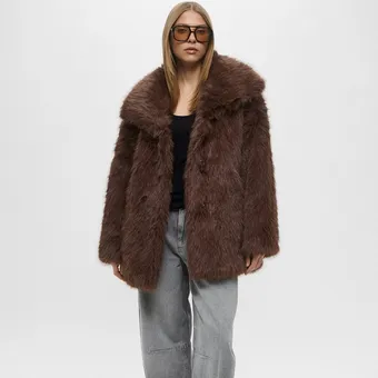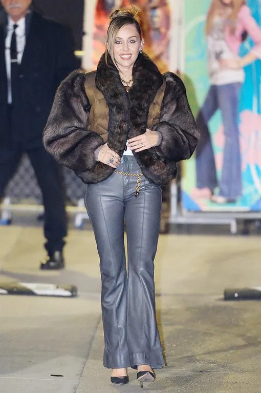 Переосмыслив на современный лад основной визуальный код стиля своей культовой героини (поп-роковая эстетика, джинсы-буткат и блеск), Майли обратилась к коллекции Chloé осень-зима 2025, и полностью повторила подиумный лук с объемной короткой коричневой шубой и серым кожаными брюками-буткатами. Дополняли образ золотой ремень-цепь и украшения.