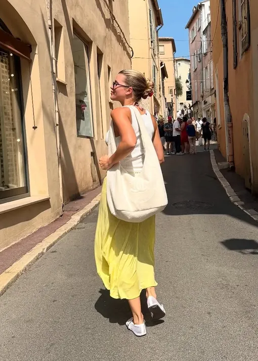 Не бойся ярких расцветок! Желтая струящаяся юбка отлично впишется в осеннюю палитру. София демонстрирует нам пока летнюю версию лука, но дополни его утепленным поло, кожаной курткой и лоферами — и вот ты уже готова отправляться за тыквенным латте.