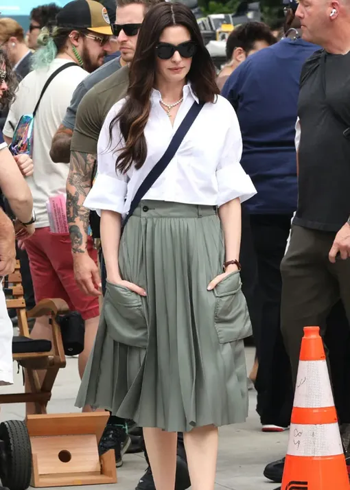 На съемках долгожданного продолжения фильма «Дьявол носит Prada» актриса была замечена в юбке Sacai оттенка хаки. Особенность модели заключается в том, что в одной вещи дизайнеры смешали два разных стиля: изящную плиссировку и накладные карманы, свойственные карго. На контрасте получается довольно эффектный лук. Носи такую юбку с белой рубашкой или тонким облегающим джемпером.