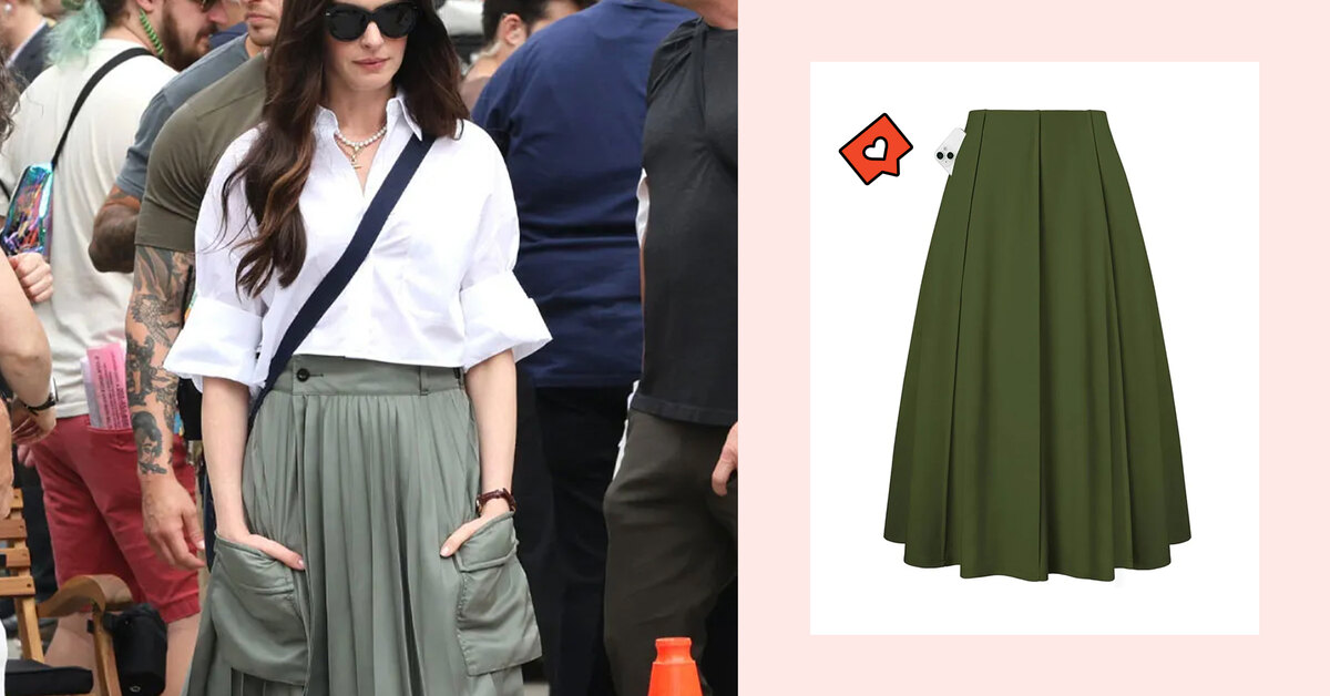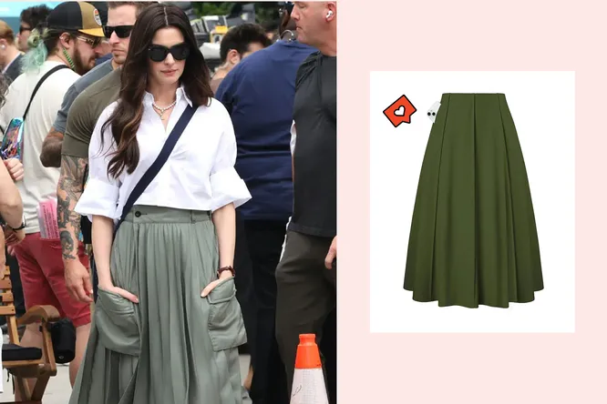 На съемках долгожданного продолжения фильма «Дьявол носит Prada» актриса была замечена в юбке Sacai оттенка хаки. Особенность модели заключается в том, что в одной вещи дизайнеры смешали два разных стиля: изящную плиссировку и накладные карманы, свойственные карго. На контрасте получается довольно эффектный лук. Носи такую юбку с белой рубашкой или тонким облегающим джемпером.