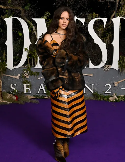 Продолжая тур по Австралии, Дженна объединила готические вселенные Тима Бертона. Ее полосатое платье Fendi из коллекции осень-зима 2025 напоминает о фирменном костюме Битджуса. Наряд в осенних оттенках актриса дополнила короткой шубой и сапогами в тон.