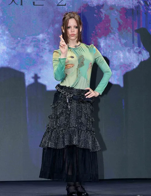 На пресс-конференции в Сеуле в рамках пресс-тура Ортега предстала в тотал-луке Simone Rocha. Фишкой образа стало зеленое боди с необычным принтом из коллекции весна-лето 2025. Дополнила боди твидовая юбка с воланами и шифоновым подъюбником, обеспечив необходимый контраст фактур. Особое внимание и на неординарные аксессуары: ремень-цепь и колье с колючками.