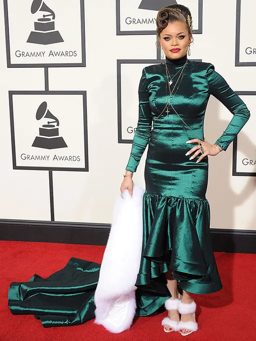Это зеленое платье гармонично смотрится со смуглой кожей Андры Дэй и высокой прической и вполне справедливо могло бы претендовать на место в списке лучших нарядов церемонии. Если бы девушка не решила «убить» несчастное платье, дополнив его бижутерного вида цепочками и пушистыми белыми тапочками на каблуках.