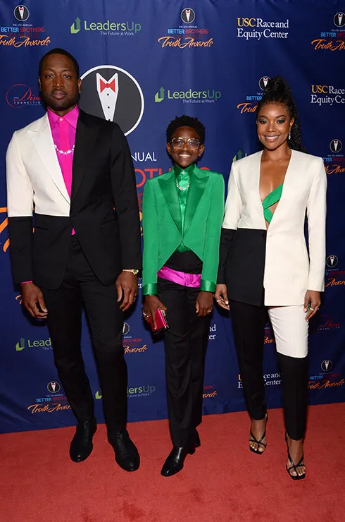 Но высший пилотаж подбора одинаковых образов продемонстрировали Габриэль Юнион и Дуэйн Уэйд. На красной дорожке Better Brothers Los Angeles 6th annual Truth Awards они появились вместе со своей дочерью Зайей Уэйд в разных, но выполненных в схожей технике колор блок брючных костюмах.