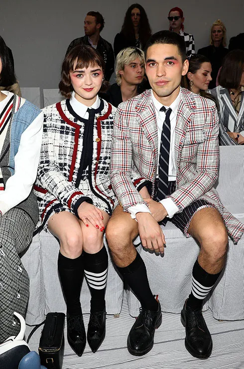Мейси Уильямс и ее бойфренд Рубен Селби появились на показе Thom Browne в похожих костюмах в клетку пастельных тонов. Сходство образов дополнительно обеспечивал необычный мейк: и у Мейси, и у Рубена глаза были подведены тенями одного и того же оттенка.