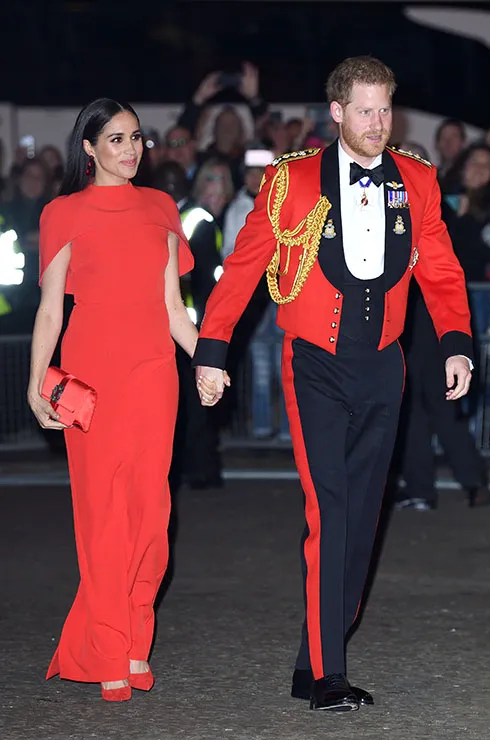 На открытие музыкального фестиваля военных оркестров Mountbatten Festival of Music принц Гарри надел парадную военную форму красного цвета. Меган выбрала наряд под цвет: красное платье-кейп она дополнила такого же цвета клатчем и туфлями.