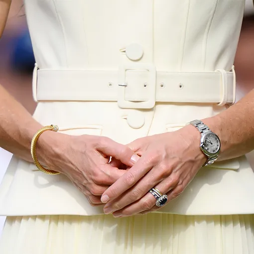 Хотя на пальце надето сразу четыре кольца, смотрится эта комбинация вовсем не вычурно. Всё дело в том, что Кейт умело соблюдает баланс массивности колец, не перегружая ювелирную подборку, и делает ставку на сочетание лишь двух видов драгоценных камней в разном исполнении (в данном случае сапфир и бриллиант). В итоге кольца смотрятся гармонично. Так что смело можешь повторять за Кейт эту ювелирную формулу.