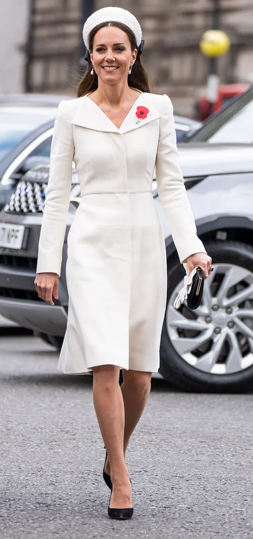 Платье-пальто — один из знаковых образов Кейт. На публике она появлялась уже в нарядах самой разной длины и оттенков. Но это платье миди оттенка слоновой кости от Alexander McQueen, которое Кейт надевала в 2022 году, смотрится особенно свежо.