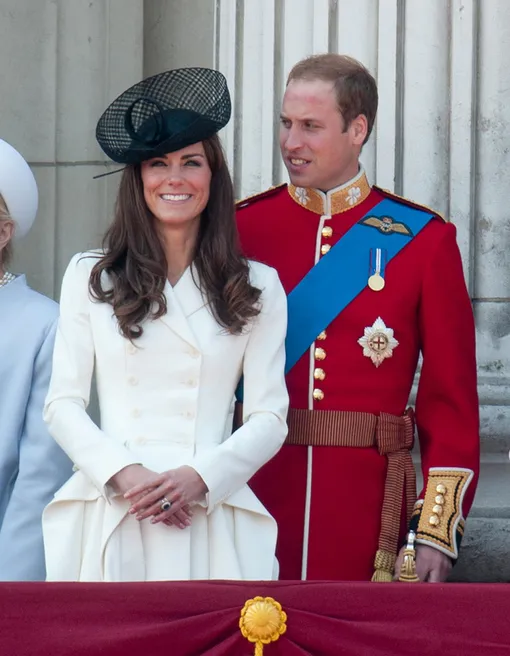 Не менее эффектно в оттенках белого смотрятся драпировки, оборки и прочие элементы сложного геометричного кроя. На одной из церемоний Trooping the Colour Кейт появилась в невероятном платье от Alexander McQueen с юбкой с оборками. Она дополнила образ черной шляпой от Sylvia Fletcher.