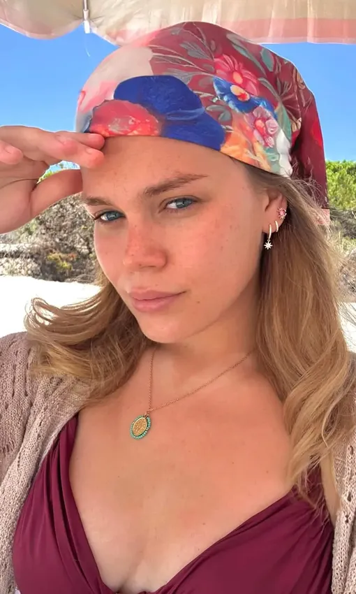 Во время пляжного отдыха на Корсике Камилла представила свою версию стилизации. Если ее бабушка обычно предпочитала завязывать платки под подбородком, то внучка предпочла более небрежный вариант в стиле банданы. Пляжный лук Готлиб: цветочный платок с оттенками бордового, оранжевого и королевского синего в сочетании с объемной трикотажной накидкой, бордовым «перекрученным» бикини и изящными украшениями.