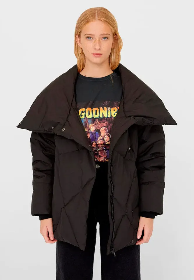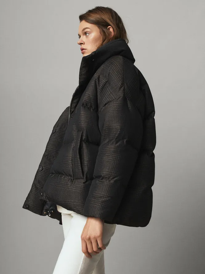 На первом месте в списке трендов стоят дутые куртки самой комфортной для холодного времени года длины — до середины бедра. Степень «дутости» ты можешь определять сама — актуальны как просто свободные модели, так и варианты гиперсайз. Главное, чтобы между телом и тканью было достаточно пространства — это не только позволяет комфортно передвигаться и утепляться с помощью дополнительных слоев одежды, но и обеспечивает лучший теплообмен. Для поклонниц классики подойдут модели нейтральной гаммы, смелые модницы могут позволить себе варианты поярче. Мы же решили совместить приятное с полезным и нашли для тебя куртку в коричневой гамме, декорированную модным в этом сезоне принтом в клетку, — универсальный вариант для тех, кто любит выделяться.