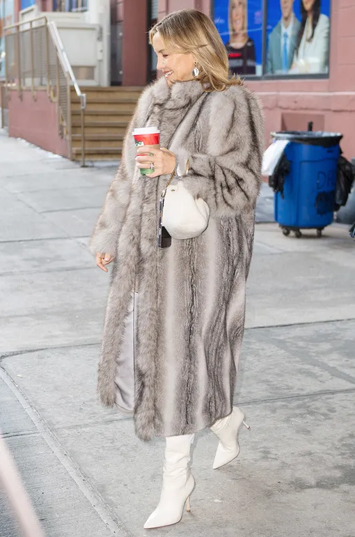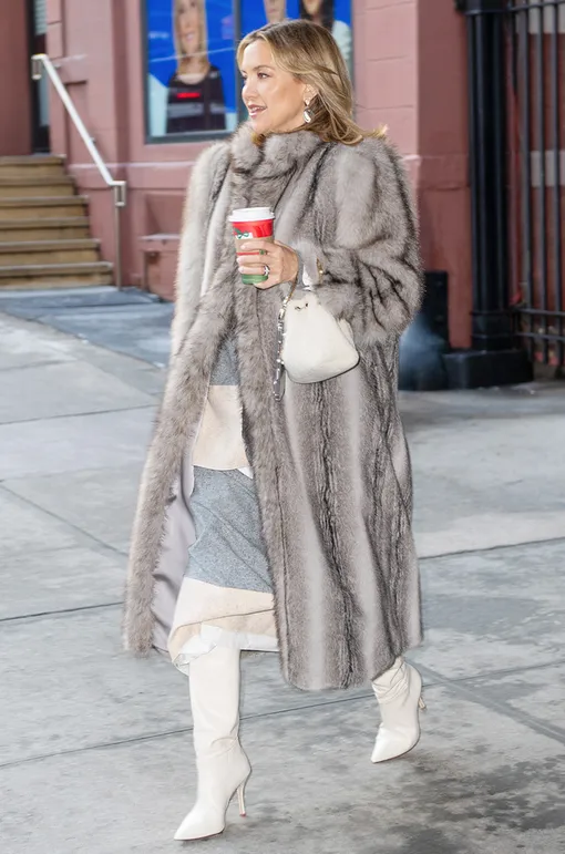 Кейт Хадсон появилась на публике в идеальном зимнем луке: роскошная серая шуба от британкого бренда Ducie, белые сапоги, трикотажное платье. Особый акцент - сумка модели «Bon Bon» от Jimmy Choo в тон сапогам, ну а серебряные серьги добавили гламурный завершающий штрих.