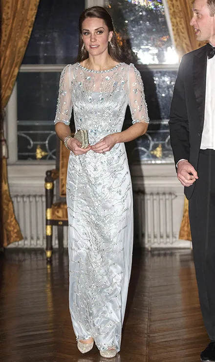 За недолгое время, отведённое на пребывание в Париже, Кейт и Уильяму предстояло посетить немало официальных мероприятий, в том числе и ужин в британском посольстве. Для такого серьёзного повода Кэтрин выбрала серебристое платье в пол, декорированное ультрамодными пайетками. Образ герцогиня дополнила блестящими клатчем и лодочками.