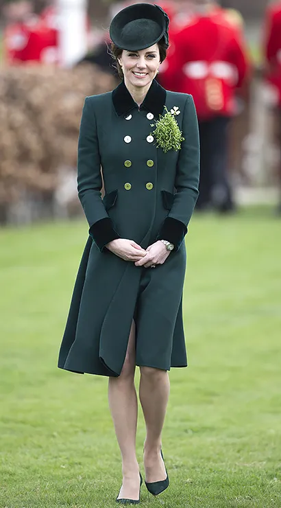 В тёмно-зелёном пальто от Catherine Walker герцогиня сначала присутствовала на параде в честь Дня Святого Патрика в Лондоне, а затем в нём же отправилась в Париж. Отметим, что лаконичный наряд был одинаково уместен в обоих европейских городах!