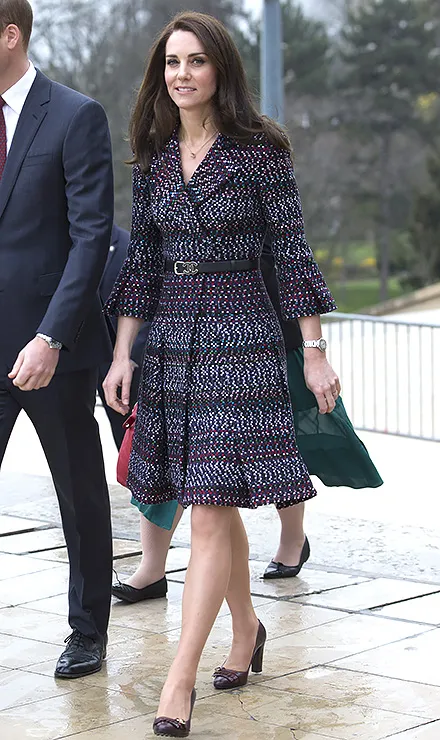 Конечно же, Кэтрин не могла не отдать дань одной из мировых столиц моды, поэтому второй день в Париже провела в пёстром платье-пальто Chanel. К элегантному и женственному наряду Кейт добавила туфли в тон и узкий чёрный ремешок, подчеркнувший талию.