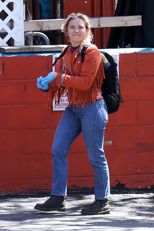 Никто из стилистов Недель мод не догадывался, что в этом сезоне новыми аксессуарами станут респираторы, резиновые сапоги и перчатки. Флоренс Пью как раз демонстрирует этот тренд. Перчатки подобраны в тон джинсам. На этом стильные решения в наряде заканчиваются.