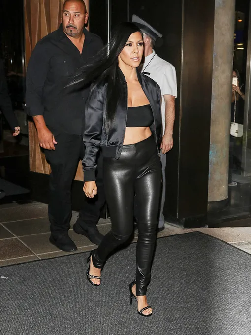Латексные штаны в сочетании с бомбером – явно не лучшее решение для звезды, которая старательно выбирает образ в соответствии с гламурной формулой «дорого-богато».