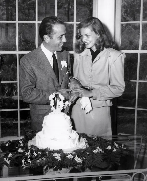 Одна из самых нетривиальных голливудских жен, актриса Лорен Бэколл вышла замуж за Хамфри Боггарта в бежевом костюме из жакета, подпоясанного ремнем, и юбки. Дело было в 1945 году.