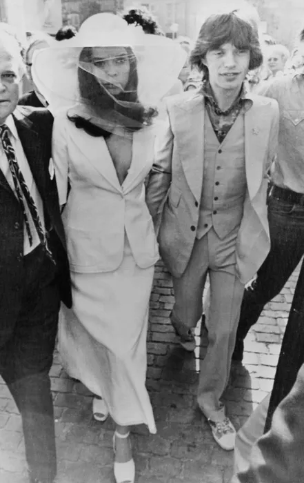 Известно, что к моменту бракосочетания с солистом The Rolling Stones Миком Джаггером в 1971 году Бьянка была в положении, и чтобы отвлечь внимание от начавшего округляться животика да и вообще заявить о себе как бунтарке и фэшн-иконе, невеста выбрала жакет с юбкой от Ива Сен Лорана. И надела их на голое тело, дополнив ансамбль шляпой с вуалью (а какие босоножки на невесте!). Да и после свадьбы никарагуанка Бьянка предпочитала максимально эффектные наряды, подчеркивающие ее сильные стороны.