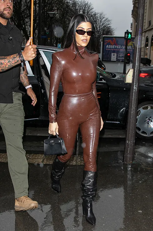 Кортни Кардашьян засветилась в Париже в костюме из латексной водолазки и обтягивающих брюк. К этому комплекту она добавила сапоги из черной кожи с широким каблуком и черную сумочку.