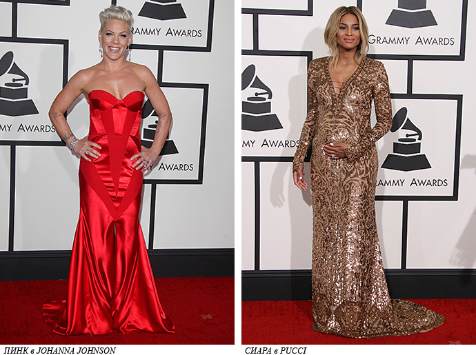 Еще одна «блестящая» певица – Тейлор Свифт в Gucci Première. Платье прекрасно смотрелось на высокой и худенькой девушке. Беременная Сиара тоже появилась на красной дорожке в переливающимся золотом платье от Emilio Pucci, которое очень красиво подчеркивало положение соул-дивы.