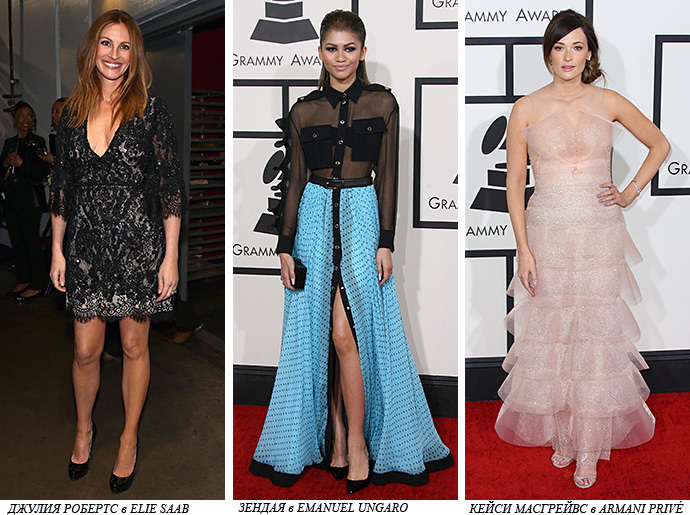 Молодая певица и актриса Зендая появилась на церемонии в интересном платье из весенней коллекции от Emanuel Ungaro. Анна Кендрик выбрала платье от Azzaro c глубоким декольте и вырезом на юбке.